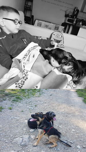 Tyson est un berger allemand x boxer de 2 ans et demi que nous avons adopté le dimanche 11 mars 2018. Certains bénévoles étaient réticents a nous le confier car soit disant il etait agressif (nous n'avons jamais connu le contexte), mais pour nous c'était lui LE chien, nous sommes littéralement tombé amoureux de lui. Tyson avait des probleme avec ses congénaires (il aboyait constamment et parfois se jetait dessus), pour essayer de comprendre le pourquoi du comment du avons décidé de faire appel à Nathalie Delmas (educatrice canin - diplomé d'etat) pour nous aider a comprendre... Le bilan a été qu'il avait un probleme de communication avec les autres chien, de la peur et de l'anxiété... nous faisons des séances toutes les semaines avec elle et cela jusqu'à aujourd'hui nous a amené a une magnifique amélioration. Aujourd'hui Tyson joue avec d'autres chiens, aboie de moins en moins, nous pouvons même nous permettre de le lâcher dans la nature. Je remercie Nathalie car sans elle et son super et admirable travail nous pourrions meme pas emmener Tyson partout avec nous et meme pour lui sa qualité de vie est meilleure sans peur... Mais le plus beau dans l'histoire c'est que depuis 4 mois notre fils de 5 ans ne prend plus de traitement médicaux pour ses troubles du comportement , Tyson est devenu un traitement pour lui, il le calme, l'apaise et le canalise .... il est devenu indispensable dans sa vie, il est son ami, son confident et grace a ce chien notre fils a une meilleure qualité de vie alors que Tyson n'a jamais etait éduqué pour etre un chien de traitement. En tous cas je souhaites vraiment remercier la SPA de nous avoir fait rentrer Tyson dans notre vie, Nathalie Delmas (une educ en or et bien plus encore) pour cet incroyable travail qu'elle fait pour nous aider et merci a Tyson pour nous apporter amour, rire et bonheur au sein de notre foyer