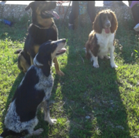 Nous avons commencé par des cours individuels, puis avec les deux chiens de Nathalie(qu'il faut remercier!), puis nous avons fait (et continuons encore aujourd'hui) des cours collectifs avec d'autres maîtres et leurs chiens ; à distance principalement puis en faisant des contacts. C'est un bon moyen de travailler tous ensemble, d'échanger aussi (dans une bonne ambiance) ! C'est une méthode de travail très agréable, tant pour nous que pour les chiens. Il était hors de question pour nous d'aller dans un club, où on aurait fait que renforcer le problème de Rusty de part la méthode de travail qu'ils utillisent.
