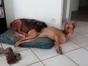 Hyppie, Djo et moi avons vraiment apprécié tes cours qui ont été très instructifs et qui se sont vraiment déroulés dans la bonne humeur. D'ailleurs, ni nous ni Hyppie n'avons eu l'impression de prendre des cours car tu as su les mener comme des promenades, des jeux... C'était très agréable d'apprendre tout en s'amusant. Nous avons trouvé tes méthodes très efficaces tout en étant douces et positives. Hyppie a fait des progrès très rapidement et la confiance s'est vite installée entre elle et nous (alors qu'au départ nous avions presque peur d'elle car nous ne comprenions pas ses réactions parfois agressives). Tu as su nous faire comprendre les raisons de ces réactions et surtout les erreurs que nous faisions. Aujourd'hui tout se passe très bien, Hyppie a vraiment trouvé sa place dans notre famille et est de plus en plus douce et câline. En plus sa méfiance envers Djo a totalement disparu et son agressivité envers ses congénères aussi (à part lorsqu'ils entrent dans sa zone de confort... mais aujourd'hui nous l'avons compris et nous savons éviter les situations stressantes). Grâce à tes conseils elle est aussi beaucoup plus cool avec Klaus et devient presque protectrice avec lui, c'est adorable à voir. Elle a aussi trouvé sa place dans l'appartement et essaye de moins en moins de tout contrôler (surtout depuis que le canapé n'est plus à elle !!!!). Les promenades ne sont plus sources de stress comme au départ car nous avons compris ce que nous devons faire et ne pas faire. Nous pouvons même la détacher dans les parcs sans problème car elle répond parfaitement au rappel. D'ailleurs le fait de la détacher a permis de resserrer nos liens et aussi de la détendre vis à vis des autres chiens en liberté. Nous n'avons plus peur de ses réactions comme au départ. Grâce à tes cours nous avons compris quel est son caractère, sa personnalité et nous comprenons beaucoup mieux son langage ! Nous te remercions infiniment pour ton aide, tes cours sont vraiment très bien fais car tu sais t'adapter au chien autant qu'aux maîtres et c'est un vrai plaisir. Le choix de Restinclières est aussi très judicieux car c'est un cadre magnifique et ça permet d'être en situation réelle. Il n'y a selon moi aucune meilleure façon d'apprendre l'éducation canine qu'en situation réelle !!! Ton amour des animaux fait vraiment plaisir à voir et ton tarif réduit pour les chiens SPA montrent ton implication pour sortir les chiens des refuges et leur permettre de s'intégrer à leur famille. C'est vraiment formidable ! Encore Merci Merci Merci pour Hyppie , pour nous et pour tous les animaux que tu as pu aider et que tu aideras!!!! On t'embrasse,A bientôt!